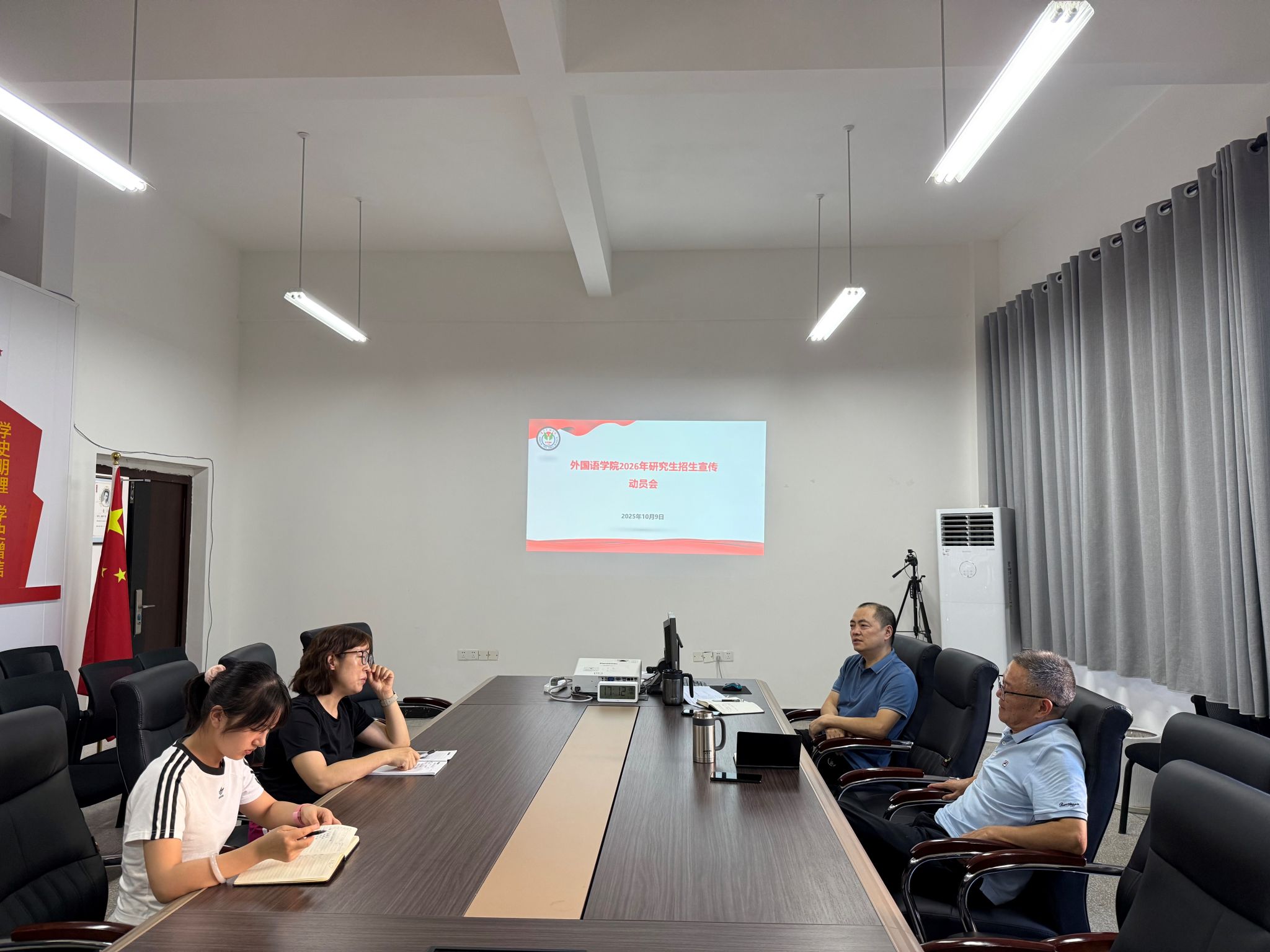 为深入贯彻落实学校关于研究生招生工作的相关精神,进一步做好研究生招生宣传工作,外国语学院于2025年10月9日在博学楼3-315召开了研究生招生宣传动员会,会议由院长刘晓林主持,党总支副书记、副院长孔云军,学工办主任杨华,研究生教学秘书佘欣然,本科辅导员张雪参会。会议旨在全面部署和推进学院的研究生招生工作,吸引更多优秀生源。