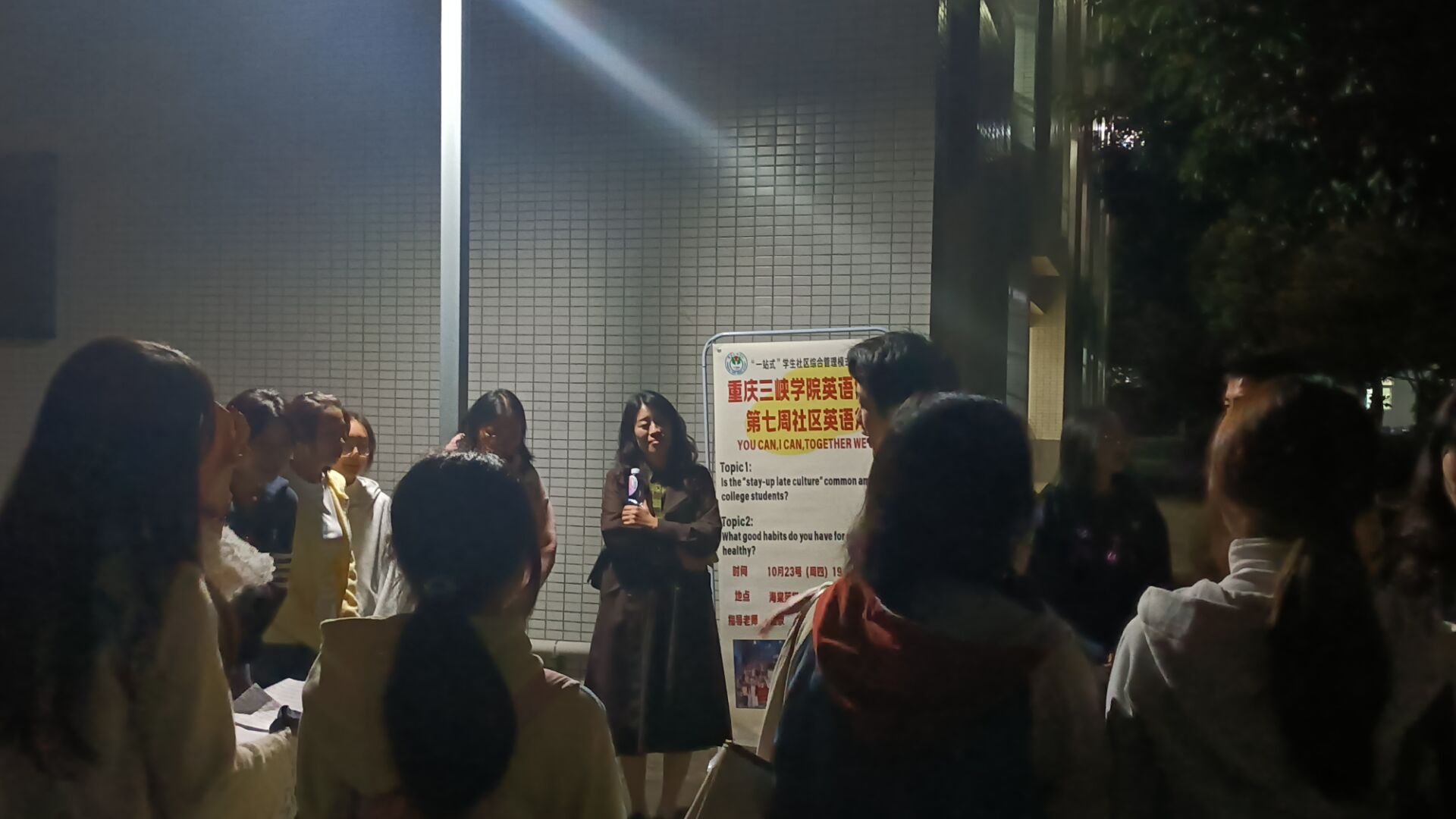 10月23日晚,我校英语协会在海棠苑学生社区广场举办了本学期第七周英语角活动,外国语学院夏荥老师到现场指导。