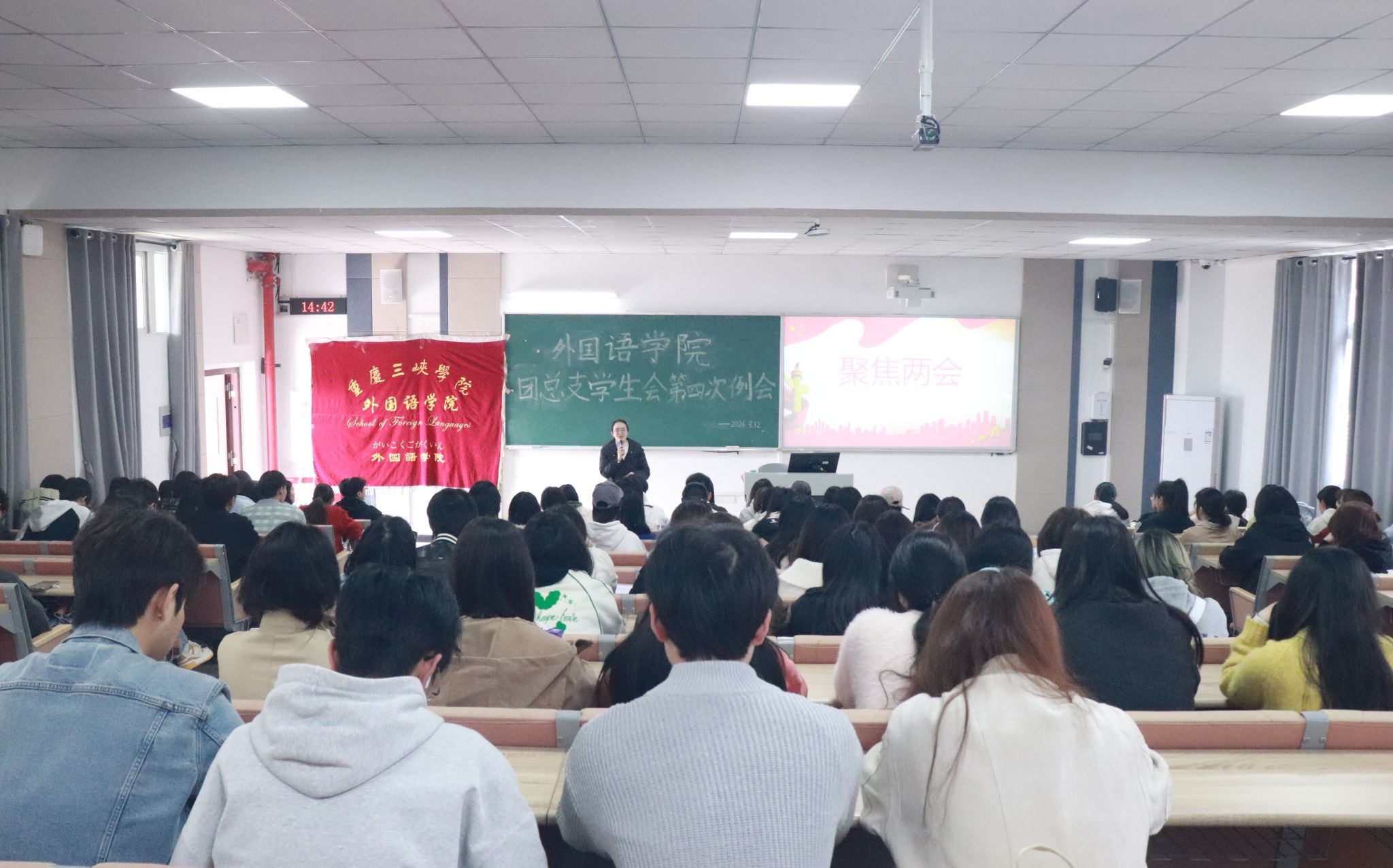 为提升学生干部思想政治素养,引导青年学生关注国家时事,3月12日,外国语学院团总支学生会在博学楼1-301开展两会精神专题学习。
