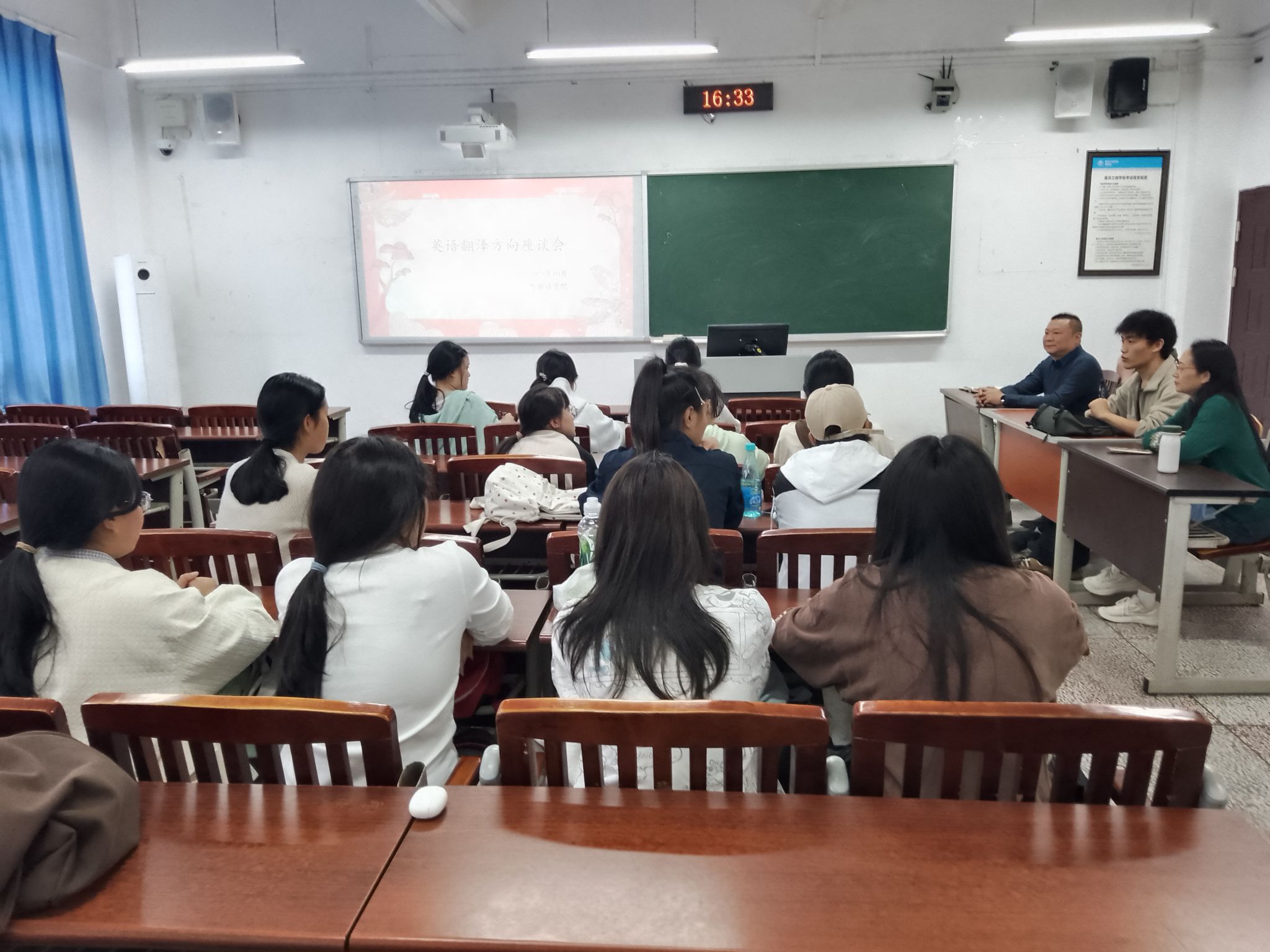 2025年10月30日下午,外国语学院在明辨楼1-406举办“英语翻译方向学生座谈会”。 刘清玉、罗云、向恩白、张开心、赵路华等任课教师与25、24、23三个年级翻译方向学生代表展开深入交流。座谈会由赵路华老师主持。