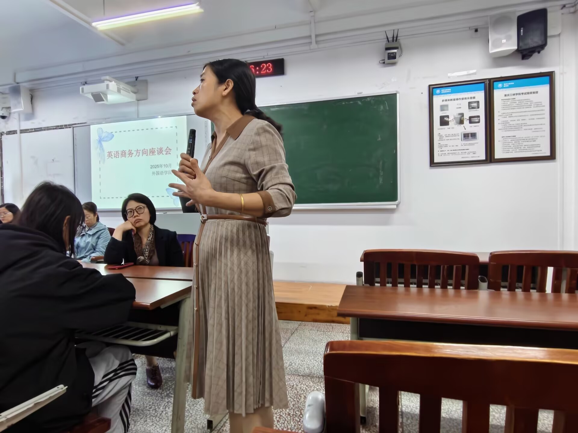 2025年10月30日下午,外国语学院于明辨楼1-403召开“英语商务方向学生座谈会”。乔春华、骆红亚、周华嫒、龚小燕、林永恒、涂艳等任课教师与25至23级学生代表围绕课程学习、职业规划及就业发展等话题进行了面对面交流。