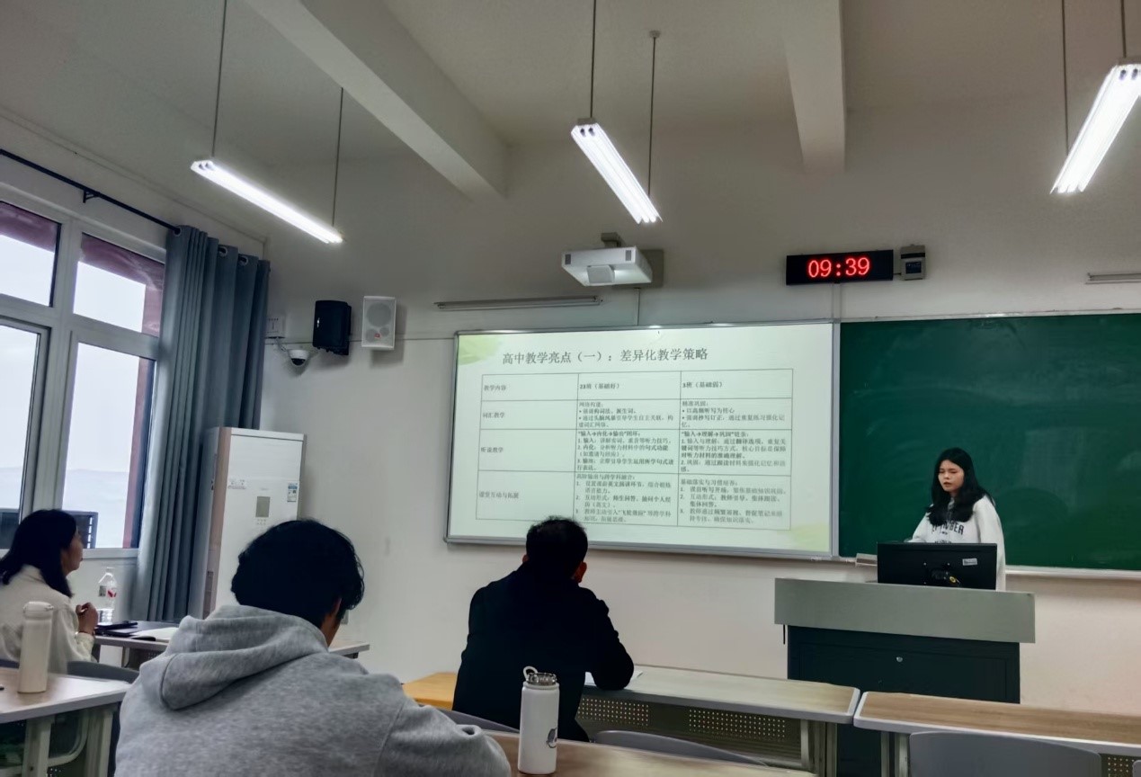 汇报中,第一组同学以问题为导向进行课堂观察,借助科学的观察量表,聚焦基于“产出导向法”(POA)理论的高三英语词汇复习课教学实践,系统梳理了教学环节的设计逻辑与学生产出效果,并提出了切实可行的反思建议。第二组同学关注高二英语课堂,以建构主义学习理论为框架,通过真实的教学案例引入,生动展示了课堂情境创设、学生自主建构知识的过程及其教学启示。第三组同学则立足跨学段视角,对比分析了初中与高中英语课堂在教学目标、活动设计、师生互动等方面的差异,并结合见习体会,对初高中教学衔接提出了具有参考价值的思考。