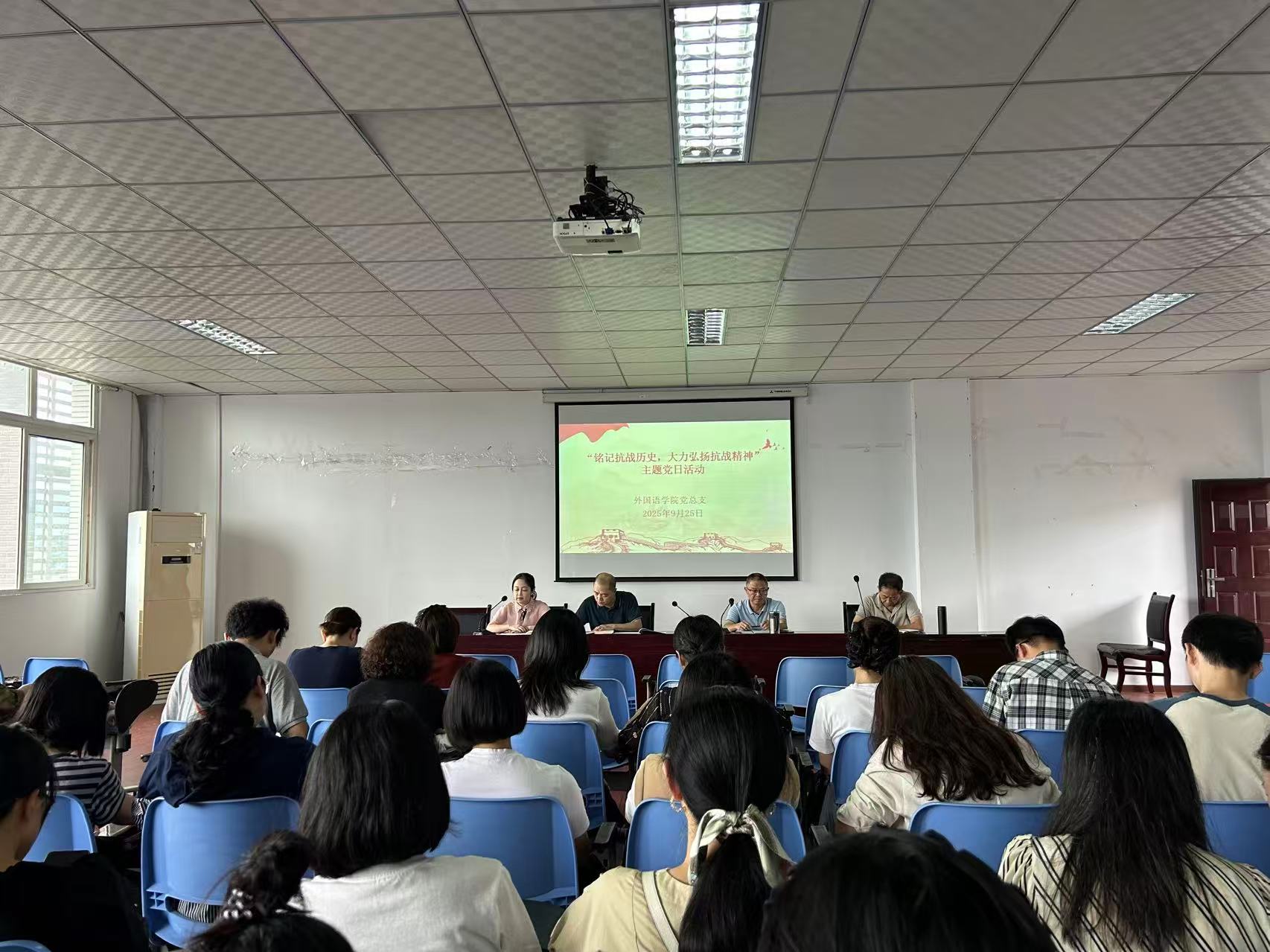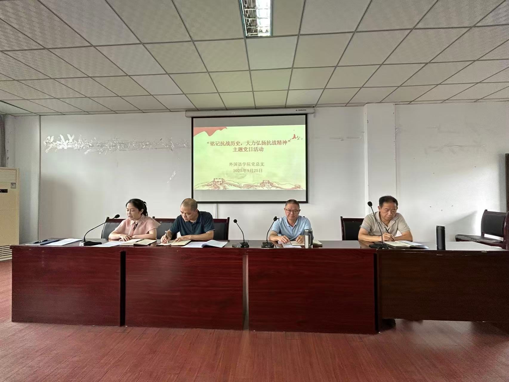 9月25日,外国语学院党总支按照学校党委9月组织生活计划部署,组织开展了“铭记抗战历史,大力弘扬抗战精神”主题党日活动。学院全体党员教师参加了学习。