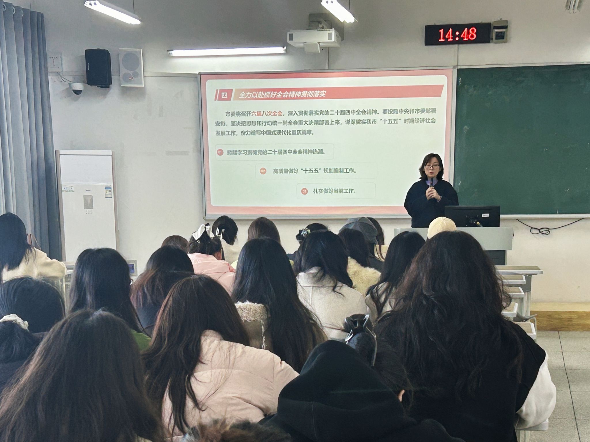 杨华紧扣全会精神,系统阐释了“十五五”时期在社会主义现代化进程中的重要意义,解读了该阶段经济社会发展的指导思想、目标任务与战略部署。她聚焦教育领域的新要求,强调要落实立德树人根本任务,构建高质量教育体系,并结合外语学科特点,引导研究生将个人发展与国家战略需求相统一,把思想和行动切实统一到党中央决策部署上来。