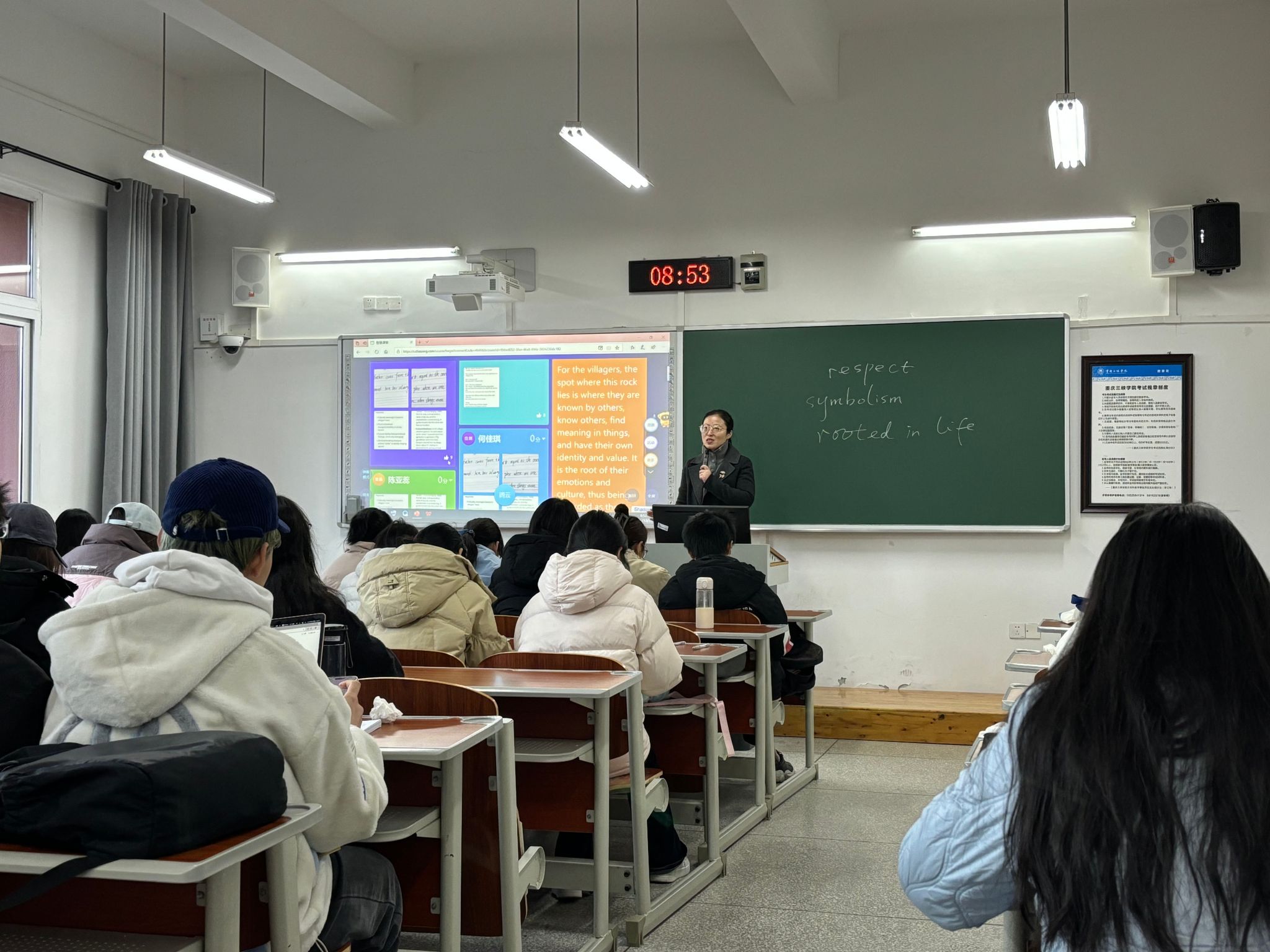 2025年12月26日上午,重庆市混合式一流课程《基础英语》教学团队成员刘娜老师,在博学楼2栋303教室呈现了一节技术与人文深度融合的公开课。课程以经典课文Green Banana中“标志世界中心的石头”为支点,依托市级一流课程建设的线上资源平台与AI智能工具,引导学生展开了一场贯通虚实、跨越文化的探究之旅。